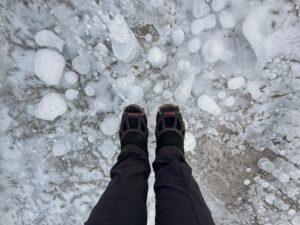 Conditions change quickly, and not all areas freeze evenly, so always use caution when walking on the ice. Microspikes and checking local conditions are essential.