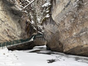 The trail follows elevated boardwalks through a narrow canyon and is considered one of the most accessible winter hikes in Banff National Park.