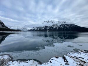 To my surprise, much of the lake wasn’t frozen yet, but that gave me my first glimpse of Banff’s famous blue water. Even muted by winter, it was still so beautiful. The wind here was intense, so after a quick stop, I headed to Preacher’s Point.